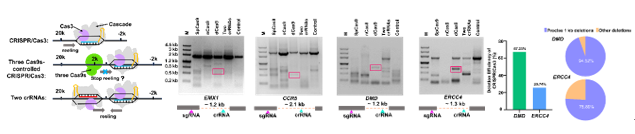 首先,研究人员基于位点特异性DNA结合蛋白可能会阻止Cas3解旋dsDNA的研究策略,将四种DNA结合蛋白(SpCas9、nCas9、dCas9和两种不同方向的crRNA)用于该研究。结果显示,在所测试的位点中,dCas9协助Type I-E均产生了精准的基因缺失,而其他3种结合蛋白则呈现较杂乱的敲除方式。