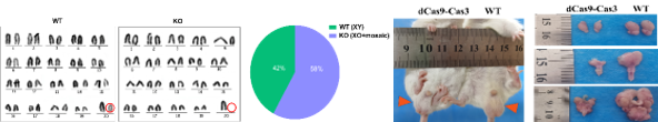 基于该策略,研究人员利用3条靶向Y染色体的crRNA,成功构建了Y染色体敲除小鼠,该小鼠模型具有性反转、Y染色体缺失、生殖结构异常等为特纳综合征(Turner syndrome)表型。进一步,通过设计位于性别决定基因(Sry基因)3'端的dCas9的sgRNA,以期实现CRISPR Type I-E介导的大片段基因精确敲除动物模型。结果表明,在dCas9的调控下,实现了部分Y染色体敲除小鼠,但保留了Sry基因,该小鼠模型未发生性反转,但其生殖功能严重障碍。