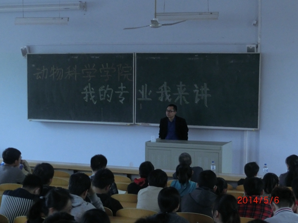 2014年5月6日晚6:00,EMC易倍“我的专业我来讲”主题活动在科学讲堂100教室开讲了。由于电路维修,学部预定的恢复供电没能如约而至,但作为第一场主讲嘉宾:动物科学专业周虚教授携课题组成员李纯锦、陈璐两位老师却如约为2013级全体同学带来了一场别开生面的、在黑暗中指引光明的专业互动,党委副书记曹伟光、辅导员肖建荣也都到场进行了学习。