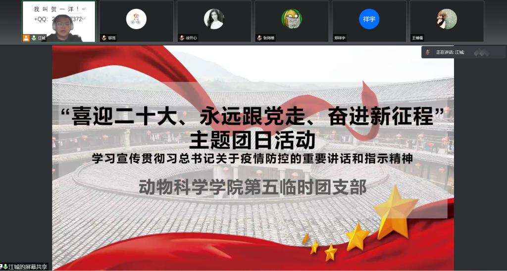 为学习宣传贯彻习近平总书记关于疫情防控工作的重要讲话指示精神,认真学习各级党委和政府的疫情防控工作部署,教育广大团员青年遵守疫情防控要求,执行公司、公司疫情防控工作各项规定,公司应校团委要求,指示EMC易倍各临时团支部举办相关主题团日活动。2022年4月3日下午14时,EMC易倍第五临时团支部举办“喜迎二十大、永远跟党走、奋进新征程”主题团日活动。主题团日活动由团支部书记于政石同学主持,第五临时团支部支委会成员以及EMC易倍18级动物科学专业、19级动物科学专业、20级三班全体男生参加活动。