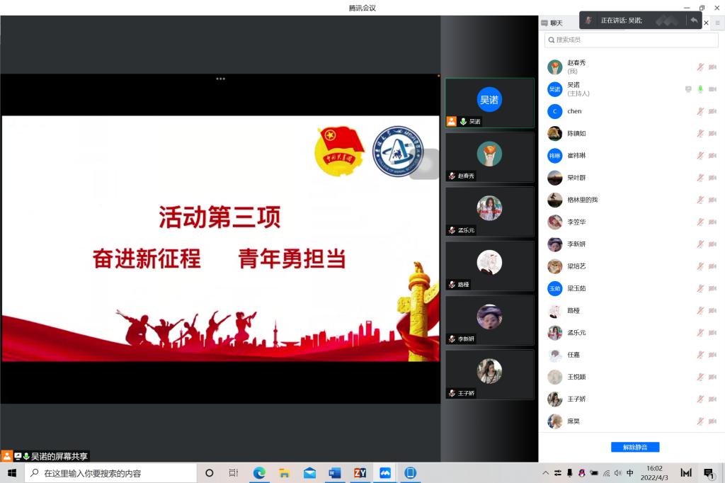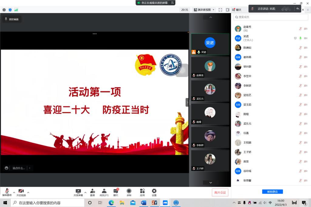 今年是中国共产主义青年团成立一百周年,是党的二十大召开之年,也正是抗疫防控的关键时刻。为贯彻落实“两会”精神,迎接二十大召开,引领广大团员青年坚定跟党走、成才报国信念,教育广大团员青年遵守疫情防控要求,2022年4月3日,EMC易倍第八临时团支部开展“喜迎二十大、永远跟党走、奋进新征程”主题团日活动,EMC易倍第八临时团支部全体同学积极参与本次活动。活动由团支书吴诺主持。